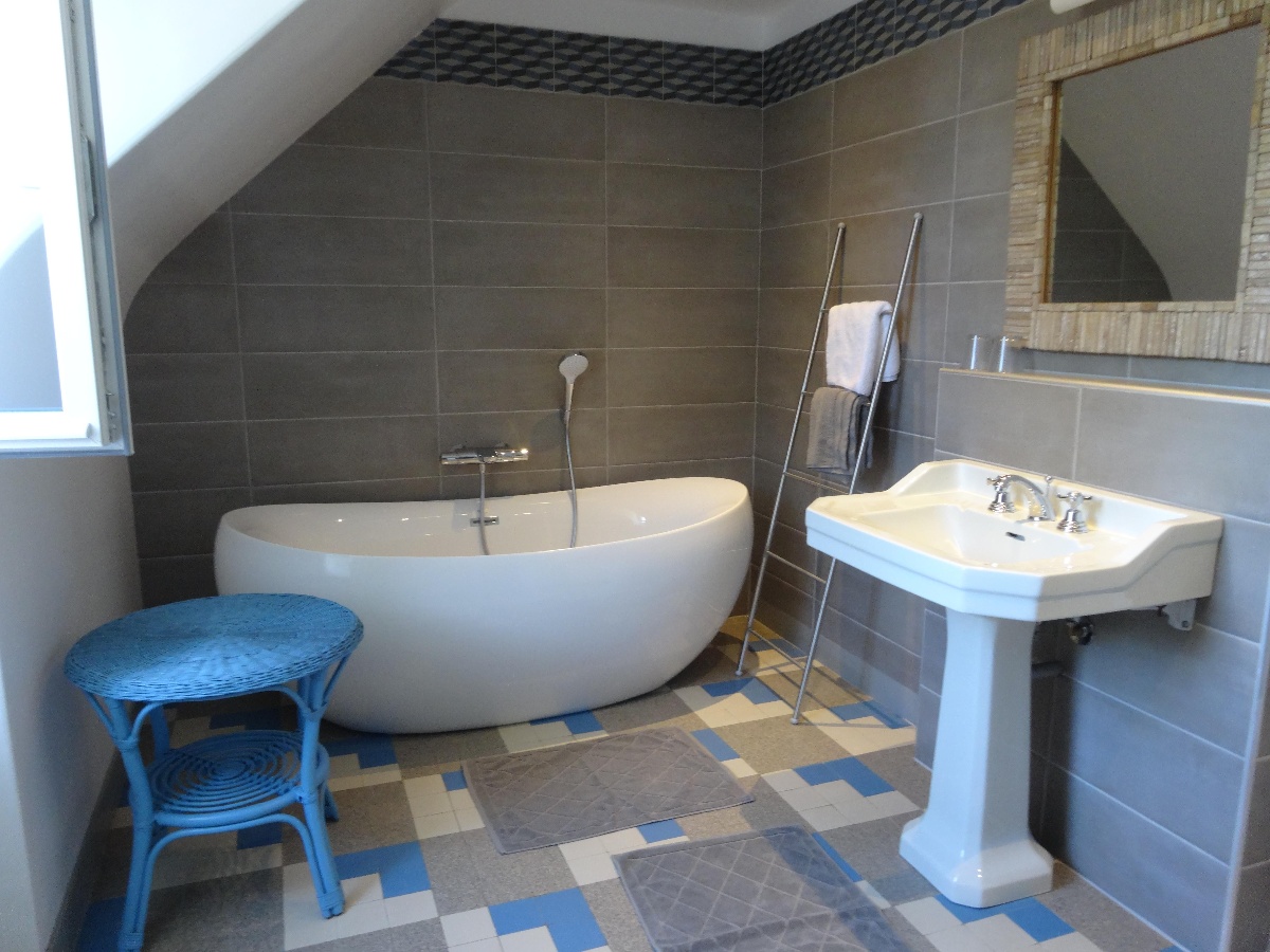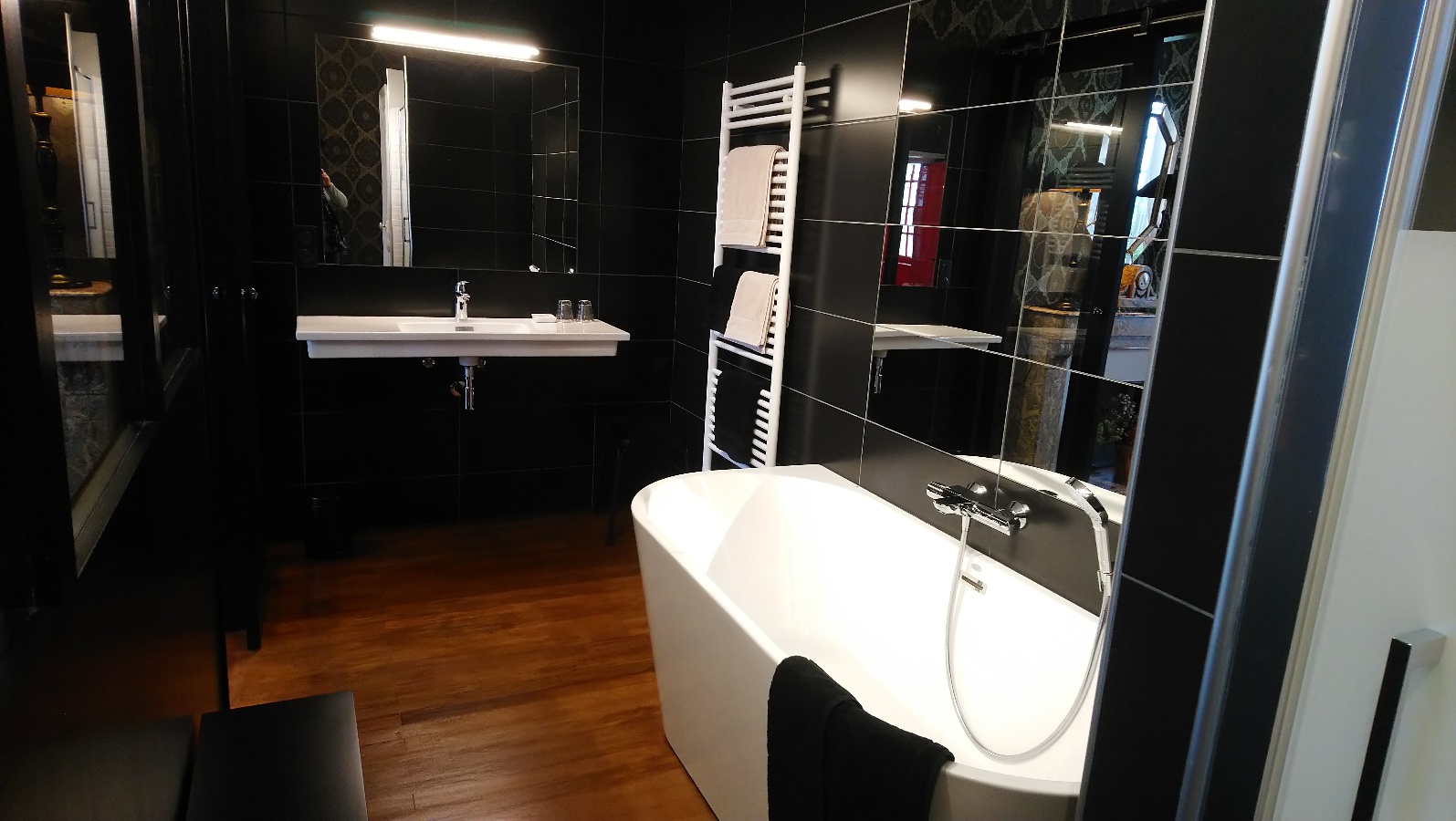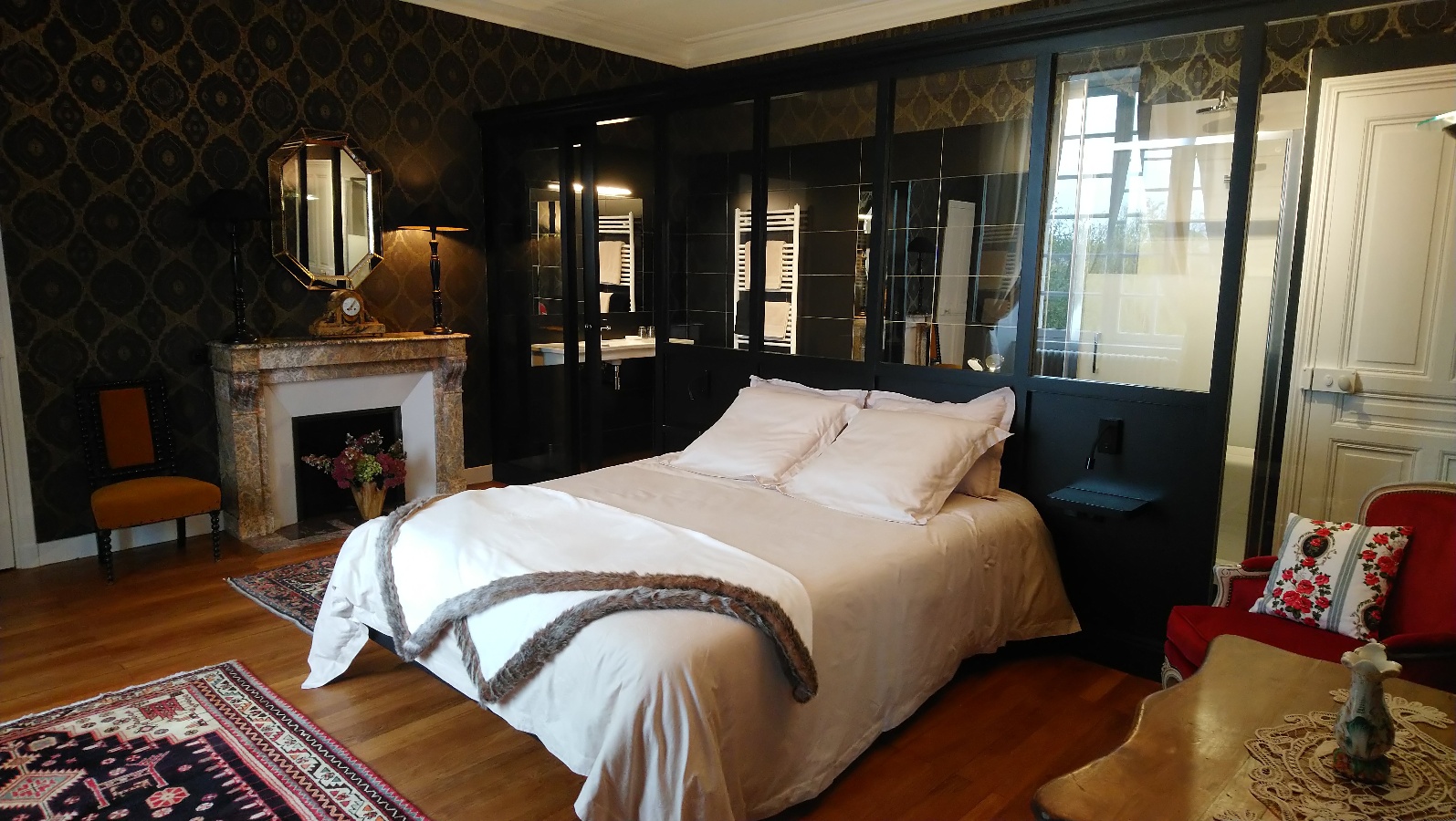 -La chambre'Dentelle' ( 30m2 avec la salle de bain );chambre avec verrière qui sépare l'espace nuit(avec lit de 160 )et la salle de bain proposant douche,baignoire et toilettes séparées.