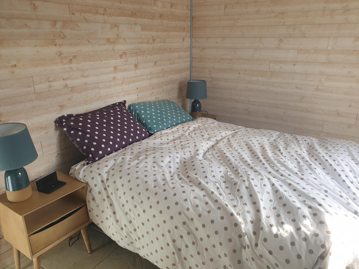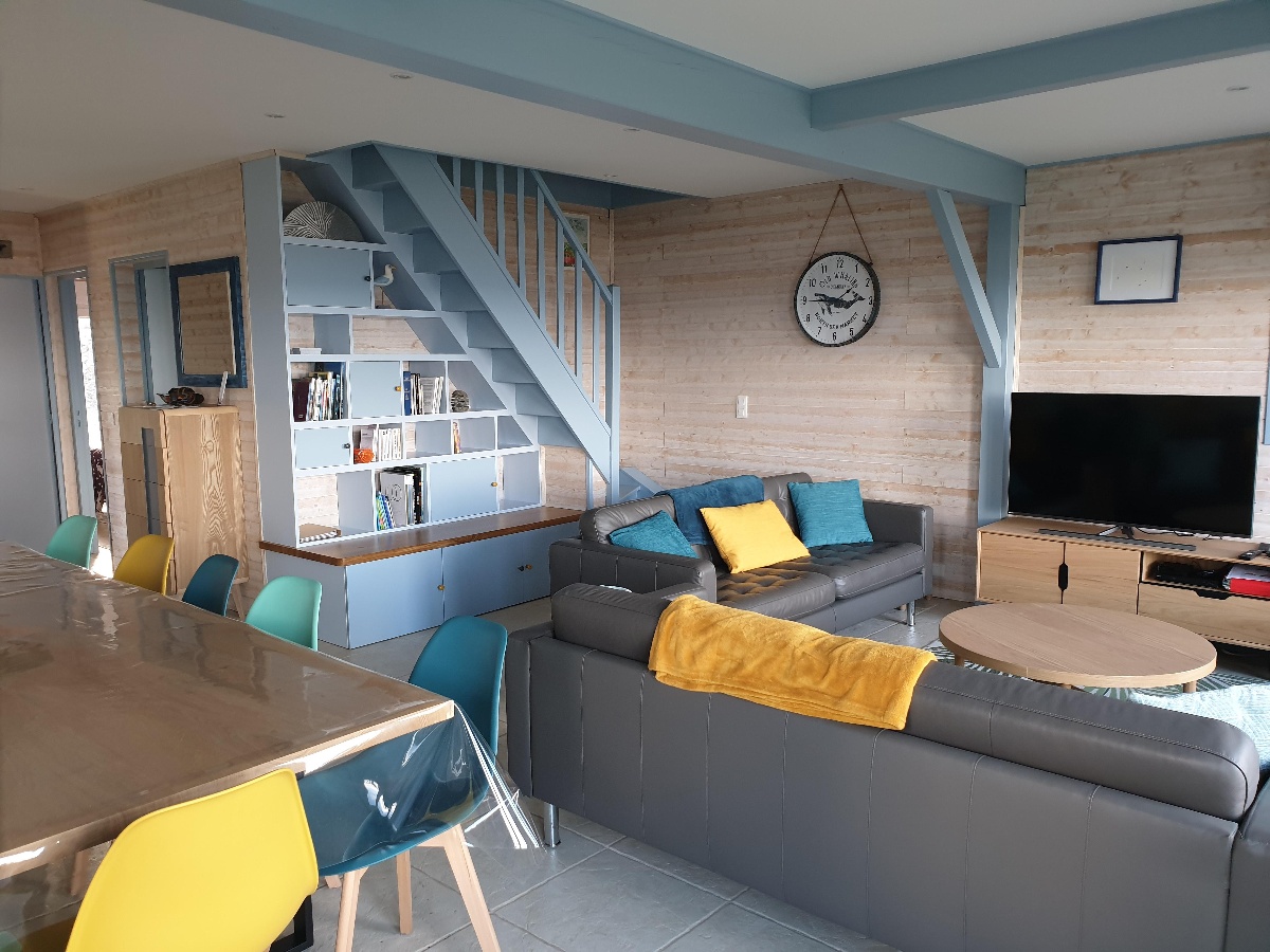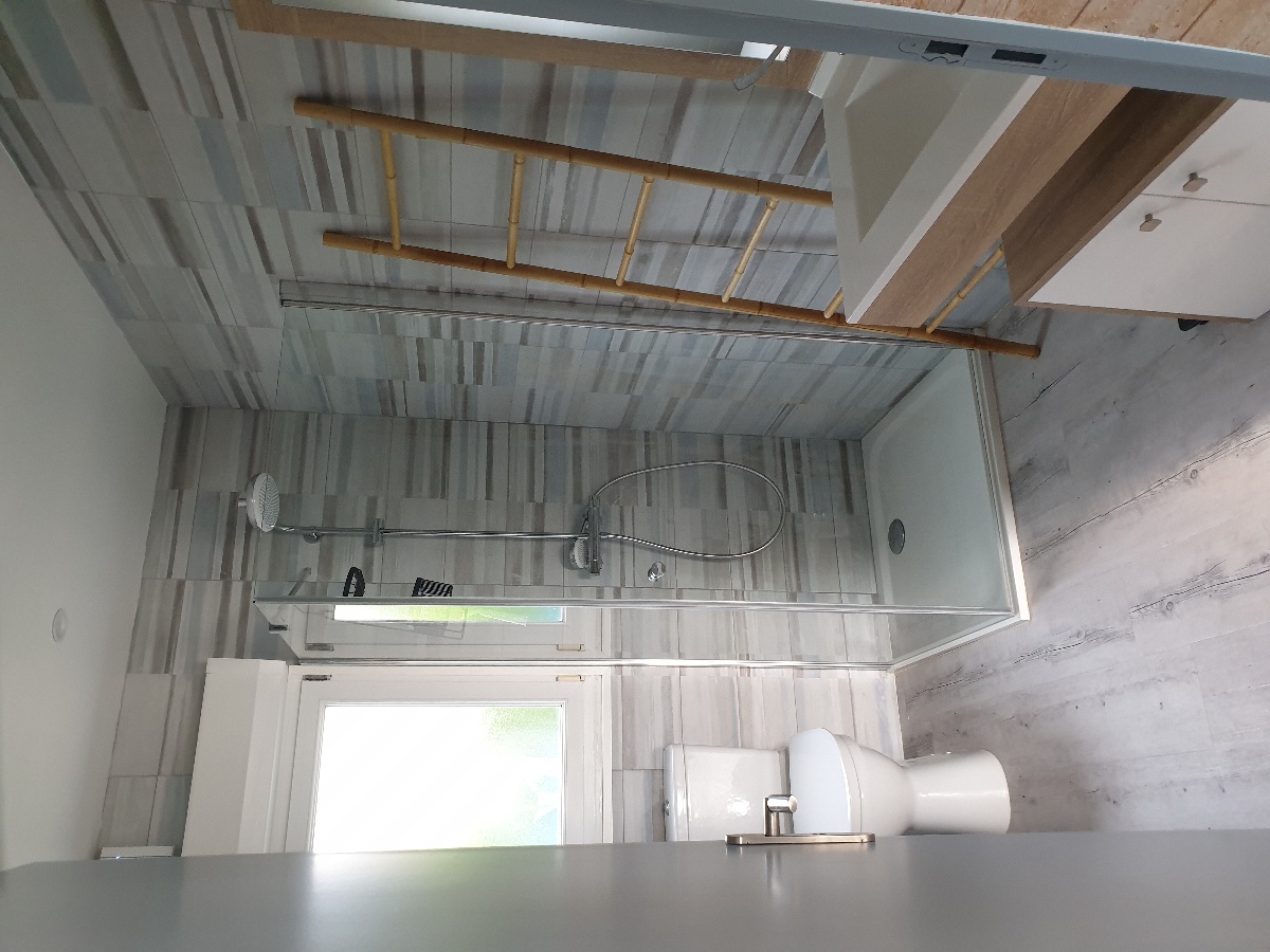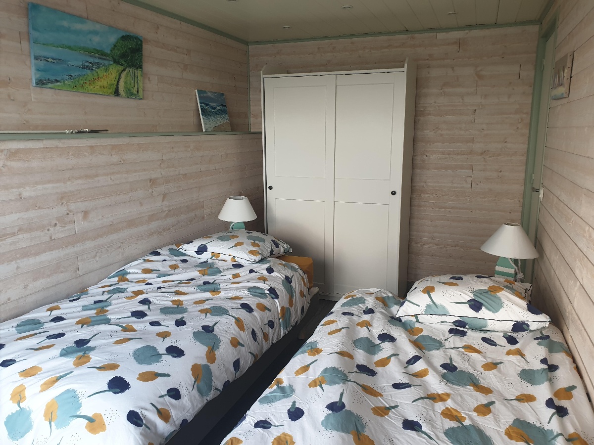 RDC : Grande pièce de vie avec TV ouverte sur une cuisine tout équipée, Salle de douche avec WC, WC indépendant, une chambre avec lit 140 X190 cm, une seconde chambre avec 2 lits de 90 X 200 cm.