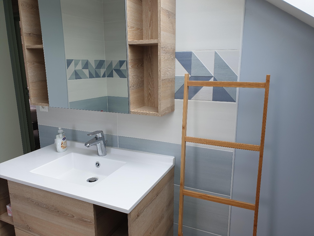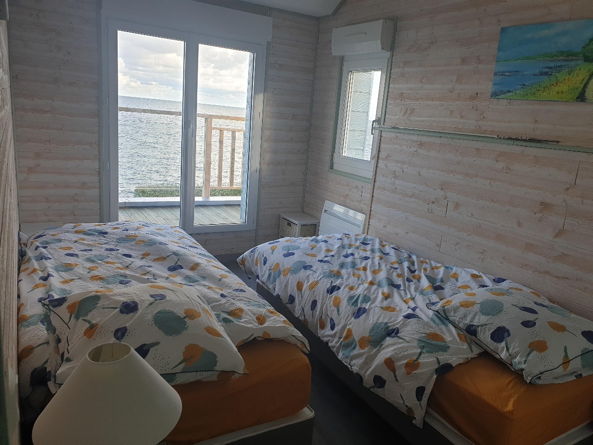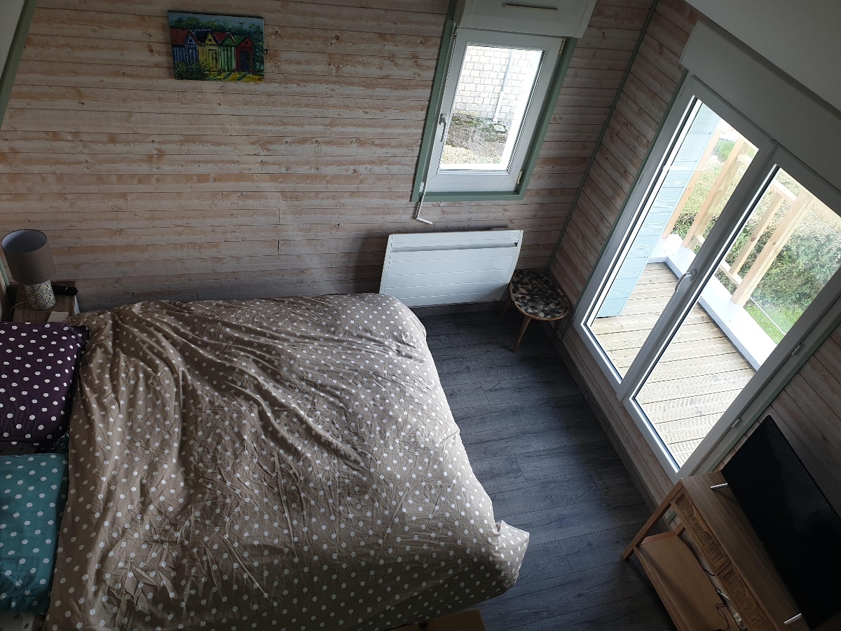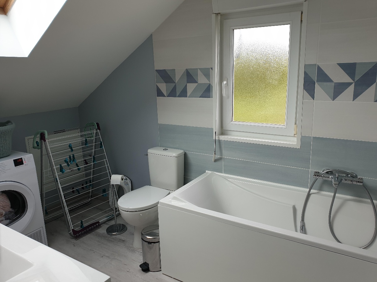 A l'étage : une chambre avec un lit 160 X 200 cm avec TV, une deuxième chambre avec 2 lits 90 X 200 cm et une troisième chambre avec 2 lits de 90 X 190 cm, une salle de bain avec baignoire.