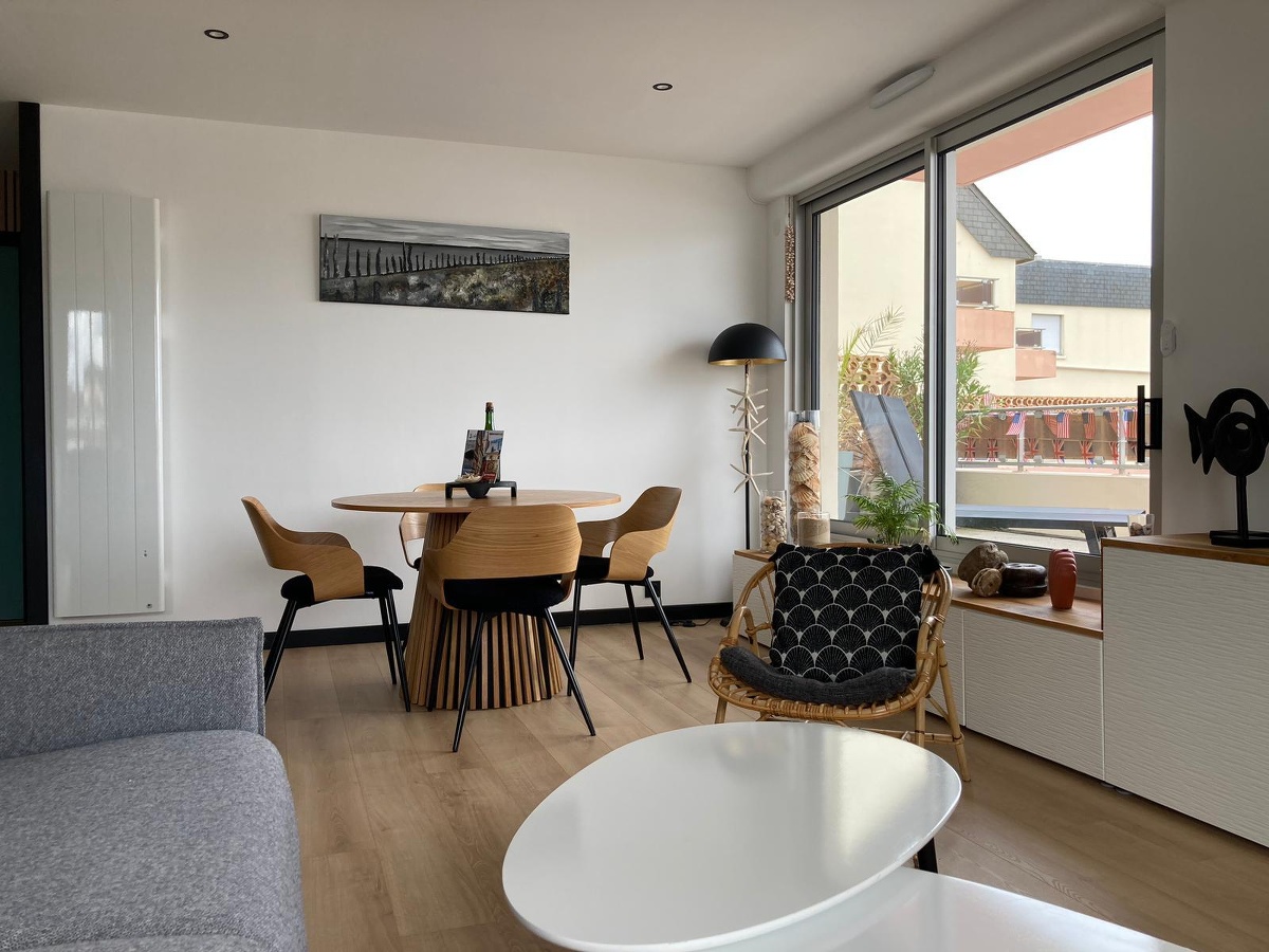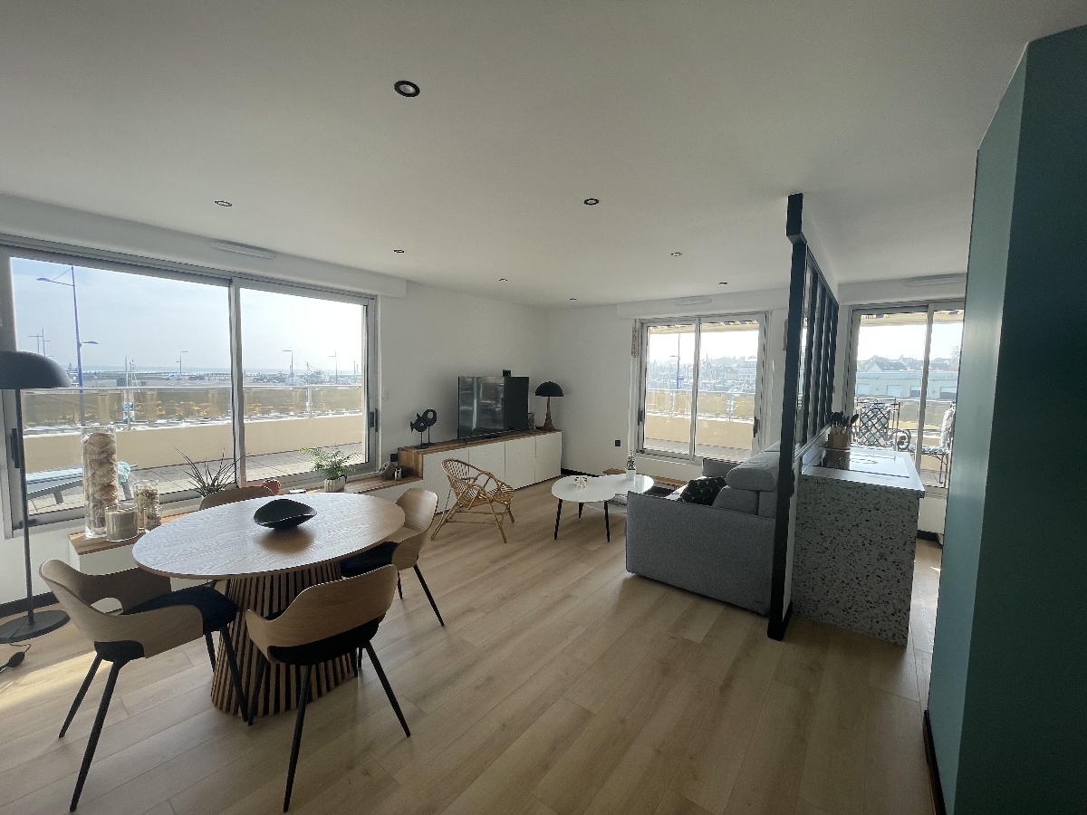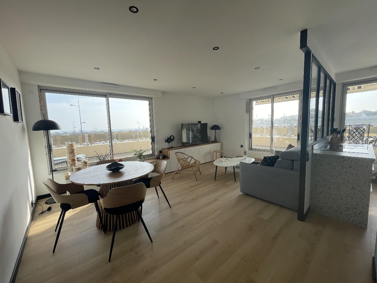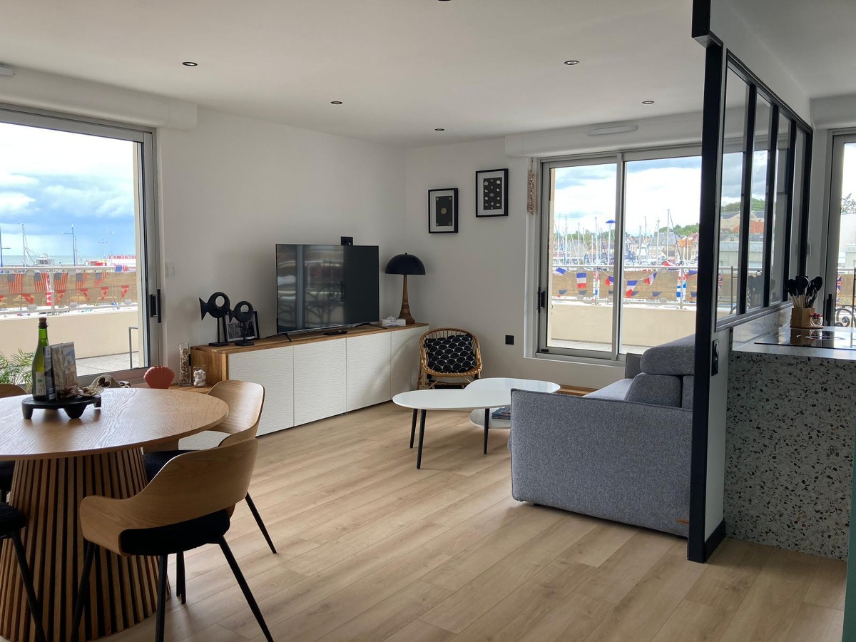Description : Magnifique appartement avec vue sur la mer et le port de Grancamp-Maisy. Entièrement rénové en 2024, design moderne et épuré, pouvant accueillir de 1 à 4 personnes. Doté d’une chambre avec un lit confortable queen size (vue mer)et d’un canapé lit dans le salon (avec un vrai matelas). Une cuisine entièrement équipée vient compléter cet espace agréable. L’appartement est bordé d’une terrasse ensoleillée. Wifi, Netflix, Canal+, Amazon Prime et télévision QLED.