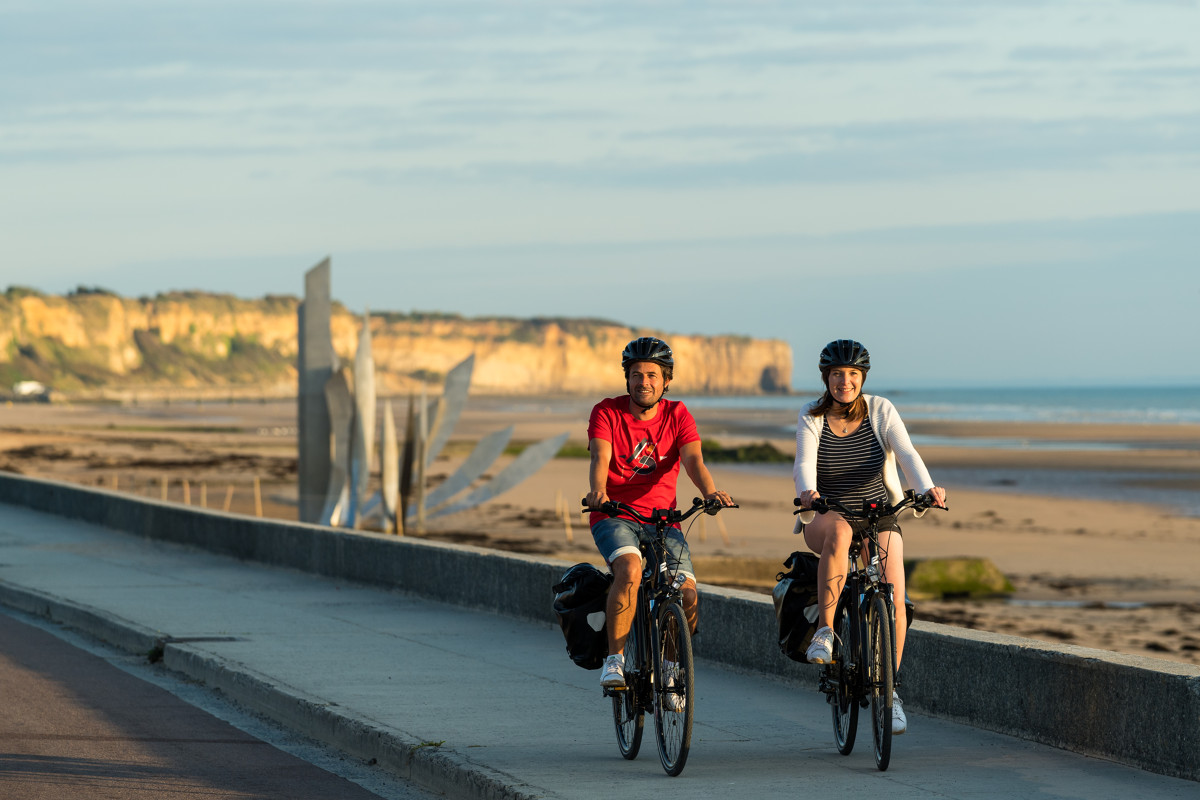 Description : De Omaha Beach à Port-en-Bessin, La Vélomaritime suit le littoral historique du Débarquement. Une balade entre plages mémorielles, falaises et panorama sur la mer, jusqu’au charmant port de pêche de Port-en-Bessin.